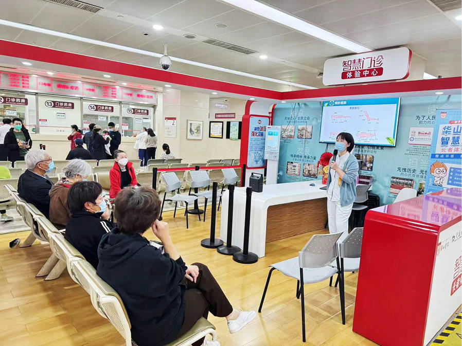 在推進新技術應用的同時,華山醫(yī)院充分考慮到目前還不能熟練使用智能設備的老年患者。在華山醫(yī)院門診二樓,每天都有公益性的課程,志愿者手把手教患者熟悉醫(yī)院看病流程,幫助老年患者方便就醫(yī)。